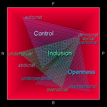 The primary characterizations of the three FIRO needs, as described by Shutz, may be coded using SYMLOG, as illustrated in the following table. Shutz describes a resolution, or optimum balance, for each need and the two extremes of the continuum as well.